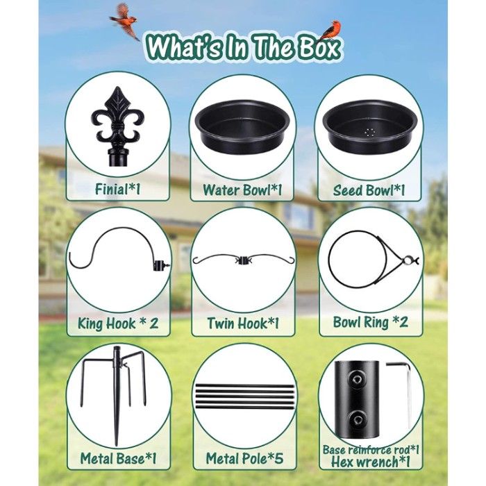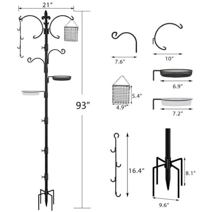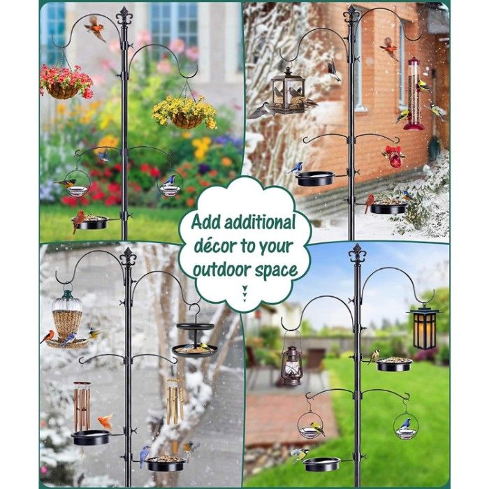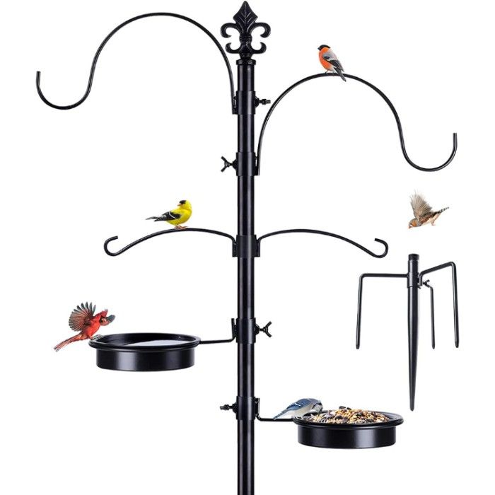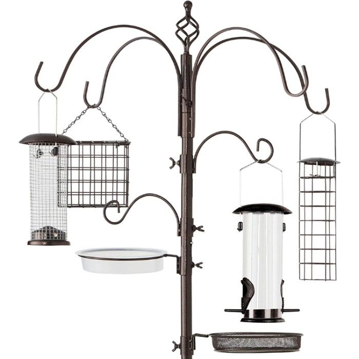With four bird feeders, a mesh tray, and a bird bath, this 5-prong base station offers birds quick meals plus plenty of drinking water. Just add your favorite seed mix or feeder balls and watch as colorful birds flock together in search of sustenance.