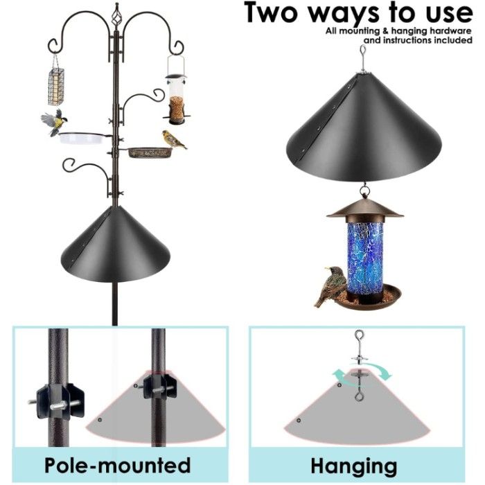 The multi-feeder feature helps you offer a variety of food sources like sunflower seed, millet seed, fruit juices, fruits, and mealworms. Lastly, the squirrel guard baffle is designed with a dome slope that refracts squirrels from jumping up or down from the station.