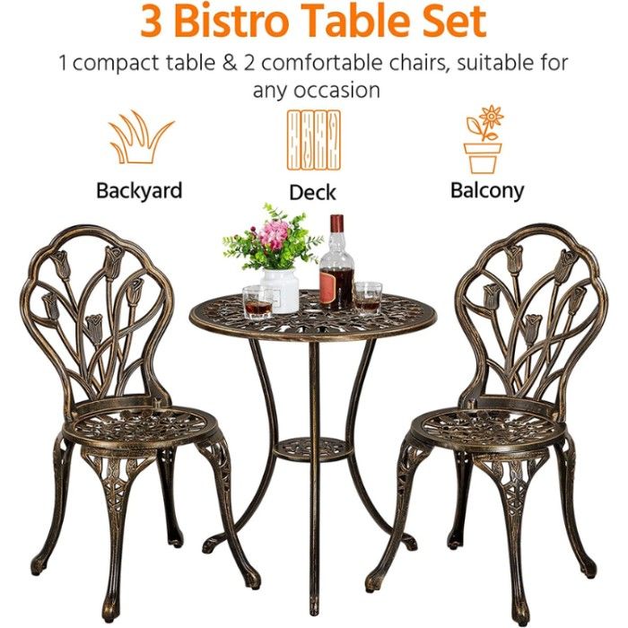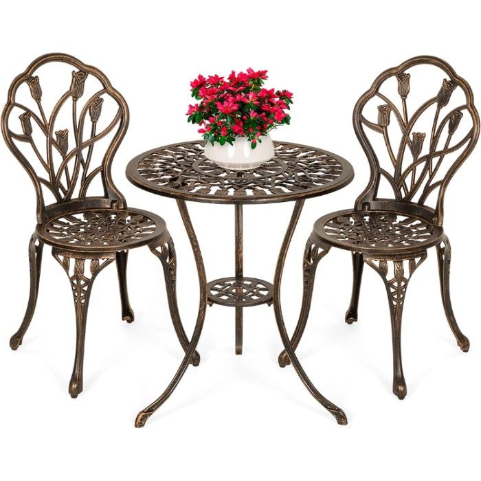 Take 30 minutes out of your day and assemble this 3 piece bistro set so you can get to enjoy an evening outside with a cup of coffee surrounded by beauty and elegance.