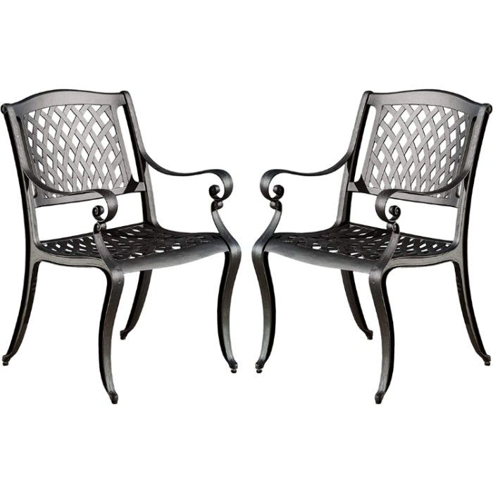 These chairs are crafted from sturdy, powder-coated cast aluminum metal, and feature a sleek black sand finish to give any outdoor space an elegant boost. The neutral colors blend seamlessly into any decor, while the intricate mesh seat and backrest add a touch of flair and character.
