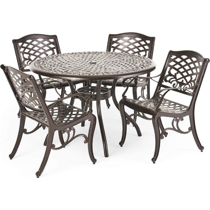This 5-piece set includes everything you need to dine in style - four comfortable chairs and a round table with a beautiful bronze finish. Crafted from rust-resistant metal, this set is sure to last for years of use while its intricate antique design adds a touch of elegance to any space outdoors.