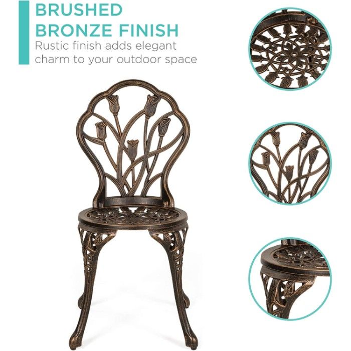 This set includes a compact table and two chairs all made from solid cast aluminum that will stand up against rust and weathering. Plus, its decorative tulip flower details matched with an antique finish will make it the centerpiece of any garden, patio, or backyard.