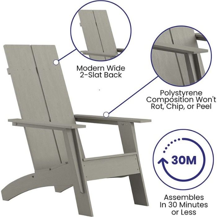 The modern age has brought modern style furniture, including modern Adirondack chairs like Flash Furniture's Finn. These chairs are made with 100% polystyrene and commercial-grade materials for indoor or outdoor use, so you know it's built to last.