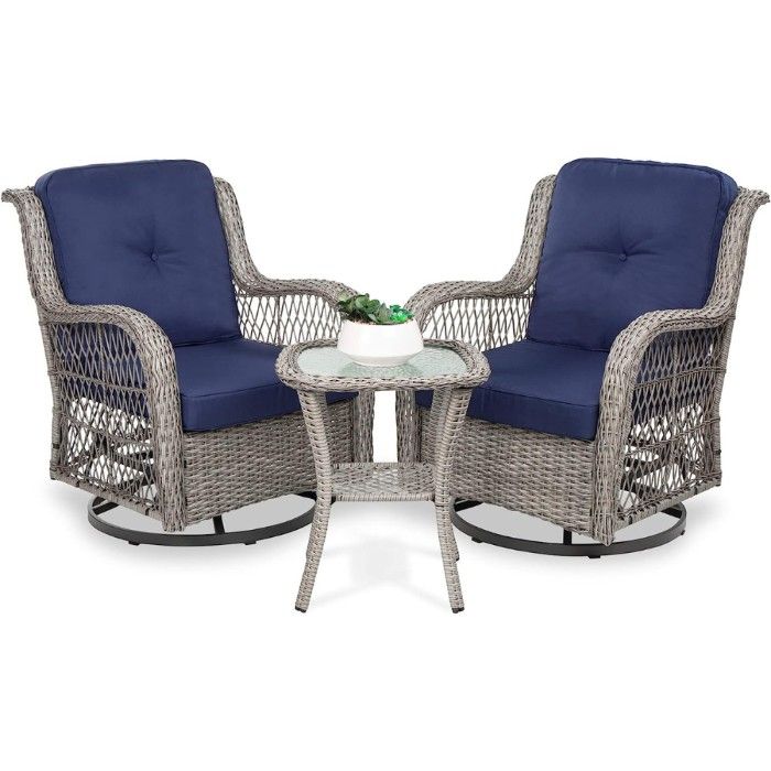 This set includes two chairs with back and seat cushions, and a matching side table with tempered glass. Make this summer even better, cozy up outside on Harlie & Stone’s Swivel Rocker Patio Chair Set.