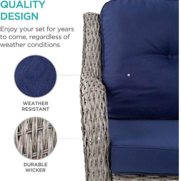This stylish set is perfect for an afternoon spent with friends and family, all enjoying their comfort while rocking back and forth on this luxurious chair. The durable build of the wicker and weather-resistant cushions is made to last for years of use and enjoyment.