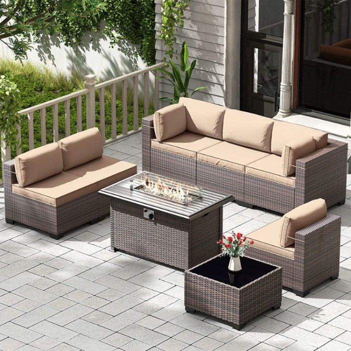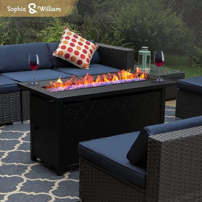 The easy-to-assemble design features weatherproof cushions allowing you to keep them outdoors without worrying about the rain or cold weather disrupting your plans. The fire pit table is sure to bring extra style, warmth, and ambiance to your backyard gatherings with its 50,000BTU gas firepit in the center of it.