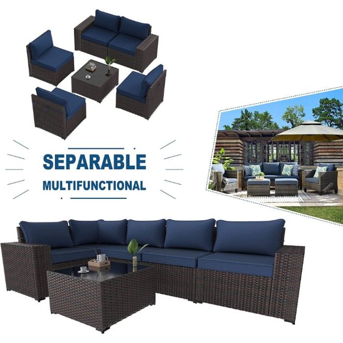 This chic set includes a fashionable rattan wicker sofa with 5 navy blue seat cushions and 1 tempered glass table. This outdoor patio furniture set is built with durability in mind. The brown PE rattan wicker is 100% weather-resistant. It won't easily succumb to wear from the sun or rain, making it suitable for indoor and outdoor use.