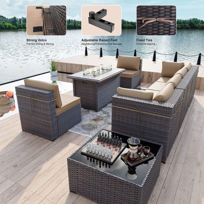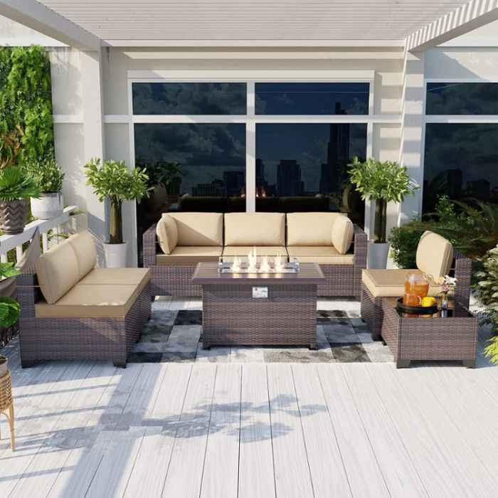 The centerpiece of this set is the 55000BTU gas propane fire pit table. Perfect for brightening up chilly evenings or gathering 'round for s'mores. You'll love hosting friends and family on the cushy outdoor sectional sofa, complete with additional seating.