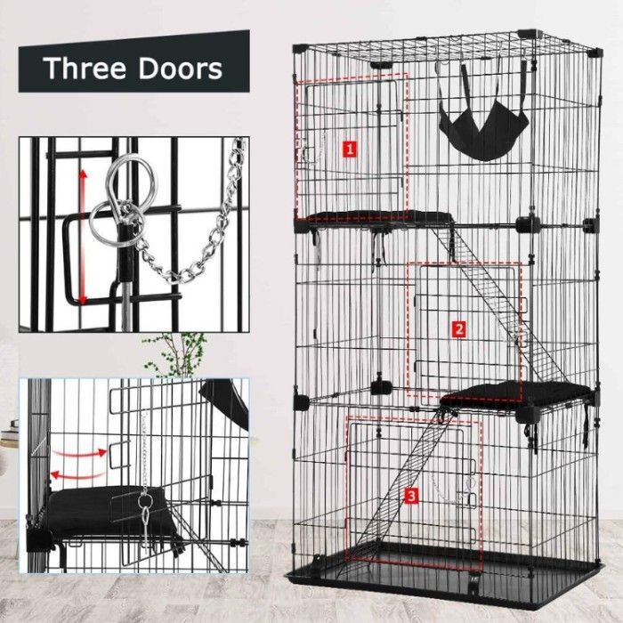 This 3-tier 67-inch kennel and playpen come with a free hammock, three cat beds, and two ramp ladders. They provide all the comforts your cat needs while they enjoy their new space. Crafted with high-grade iron wire and electrostatic black coating, this cage is built with safety and durability in mind. Its simple design adds a modern touch to any home décor as well.