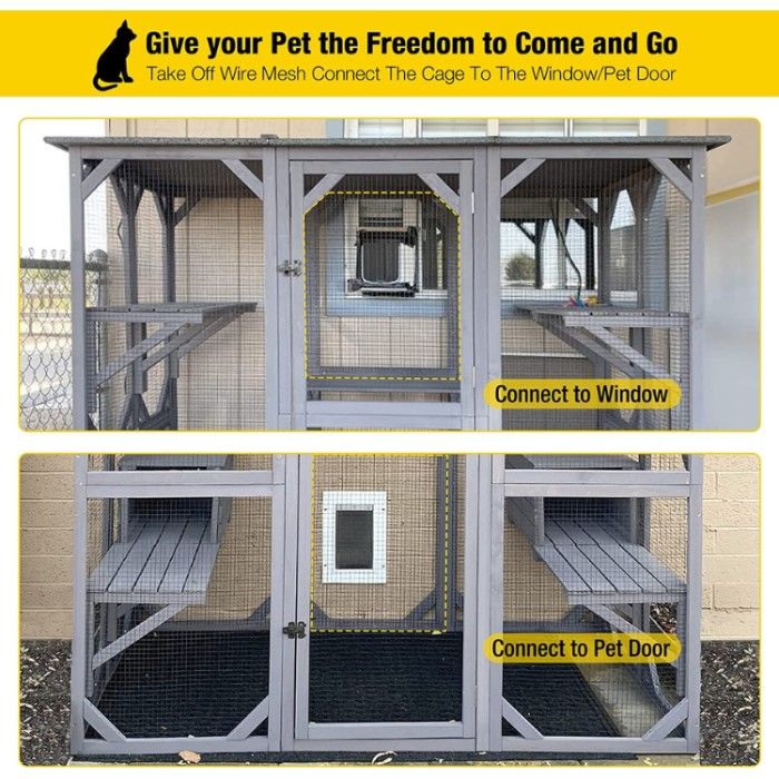 This large cat cage measuring 71 inches in size, made with high-quality fir wood, features two platforms, arched windows and doors, one small house, and a super large entry cat door which will give your furry companion the freedom to explore safely outdoors.