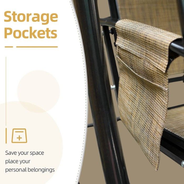 Plus, the heavy springs connecting the swing to the frame ensure a smooth and gentle rocking motion. But that's not all - the swing also includes convenient storage pockets on both sides, perfect for storing your cell phone, magazines, and even a refreshing drink.