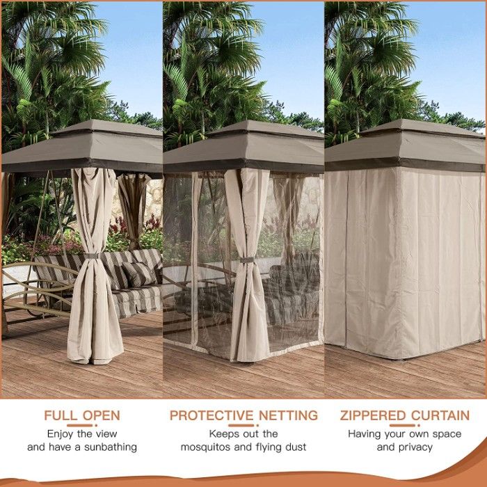 This unique 3-in-1 design offers a double-top canopy outdoor swing that comfortably fits 3 people, a gazebo with netting that keeps out those unwanted bugs, and gazebo curtains that provide shade and privacy. But the features don't stop there - the daybed is adjustable for ultimate comfort.