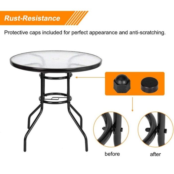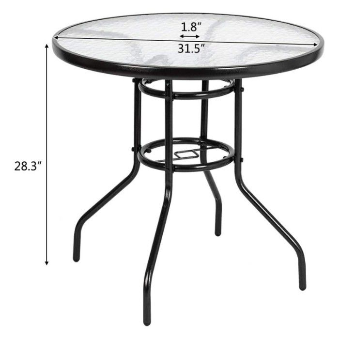 And don't worry about the weather - this table is built to withstand it all. Constructed with a weather-resistant powder-coated steel frame and sturdy, thick tempered glass top, it will hold up in any season. Perfect for both outdoor and indoor use, this umbrella table will be your new go-to spot to relax and enjoy your surroundings.