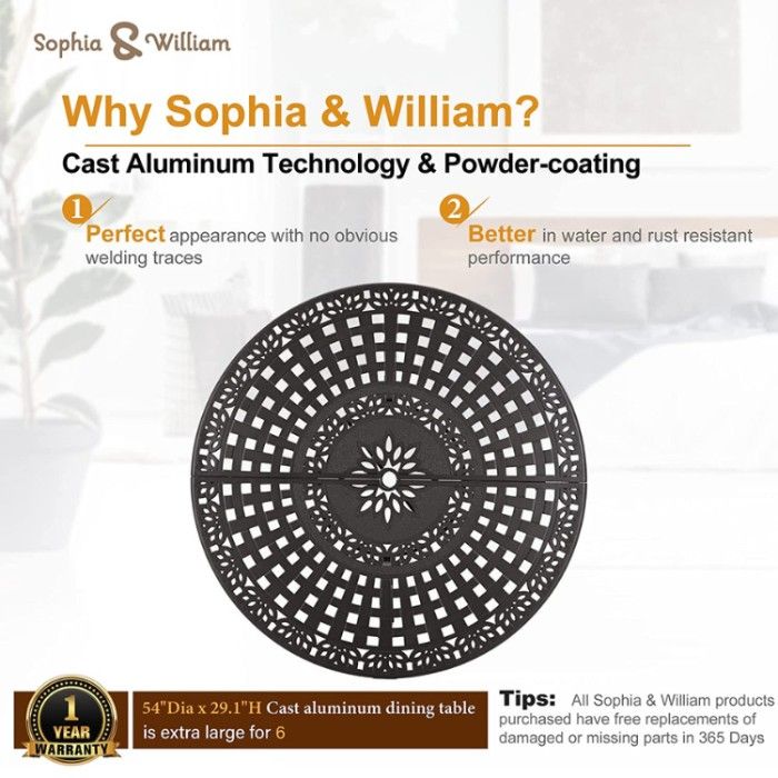 Plus, with all the necessary parts and accessories included, assembly is a breeze. Best of all, Sophia & William offers free replacements for damaged or missing pieces and a 365-day warranty, so you can enjoy your new table worry-free.