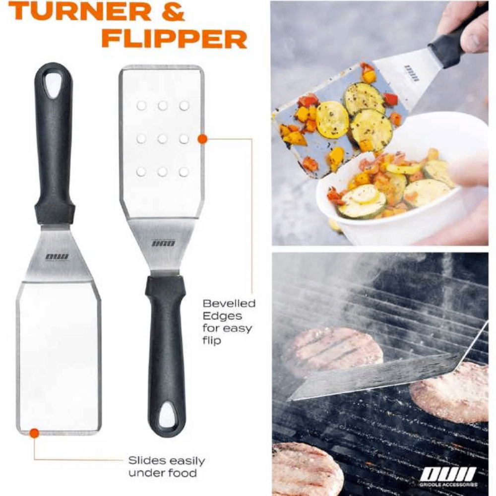 The metal spatulas are perfect for picking up thicker, heavier foods, while the chopper is great for slicing and dicing veggies or breaking up ground beef. The turners are perfect for flipping pancakes or burgers. All of the tools in this set feature heat-resistant handles, so you can cook without worry. Whether you're making breakfast, lunch or dinner, the OUII Flat Top Griddle Accessories Set has you covered!