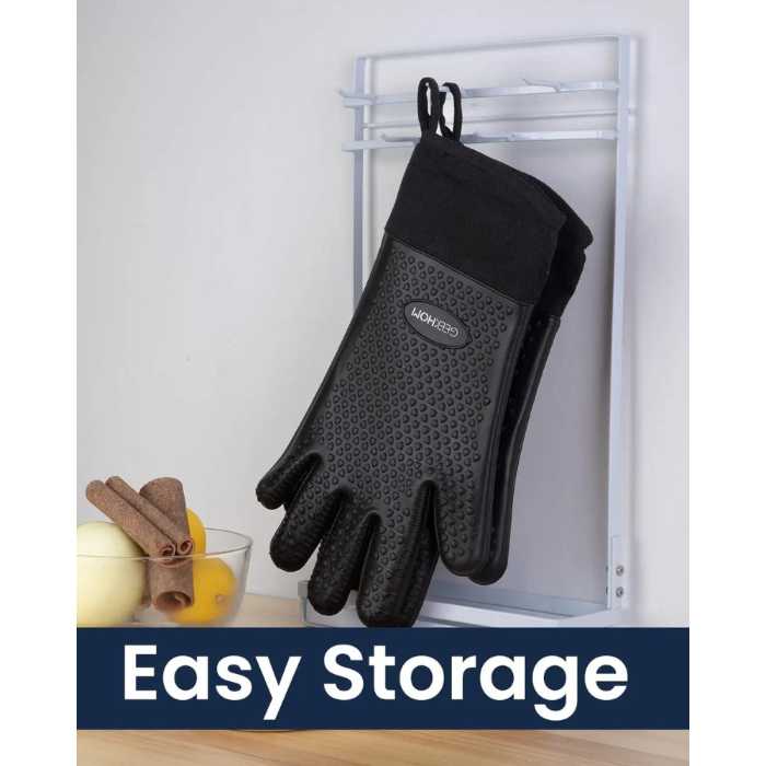 Introducing the GEEKHOM BBQ Gloves! These gloves are designed with your safety and comfort in mind, with a dual-layer design of outer silicone and inner heat-resistant cotton.