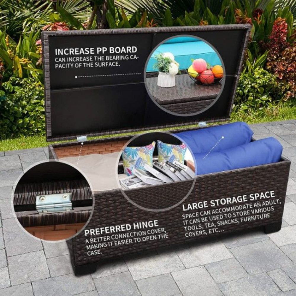It comes with an integrated storage compartment, perfect for stowing away cushions and blankets when not in use. The lid easily opens up to provide quick access when needed. To top it off, it also features a waterproof cover to protect the interior compartment from rain, snow, and other elements.