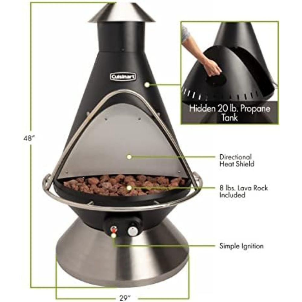 If you are looking for modern, safe, and aesthetically pleasing outdoor heating then the Cuisinart Chimenea propane fire pit is an excellent option. Specially designed with 8 lbs. of lava rocks to trap and disperse heat, providing a warm inviting ambiance while entertaining.