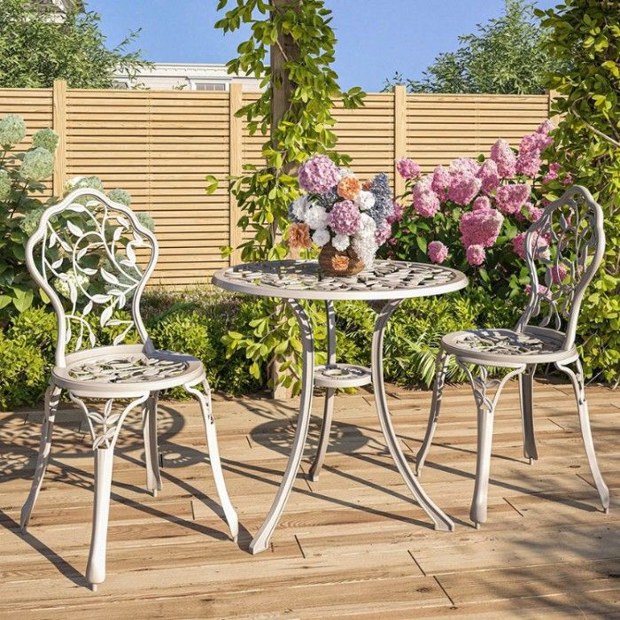 The beautiful leaf pattern adds a touch of elegance to the patio chair set, while the white finish ensures that it compliments whatever style or motif you’re looking to create.