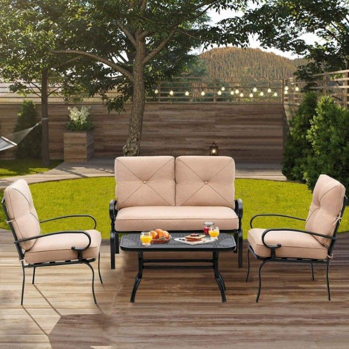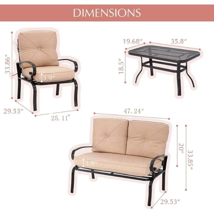 The loveseat and two single chairs come with comfortable cushions, providing cozy seating for your garden, lawn, or porch. The coffee table adds extra functionality to this set, as it provides a place for drinks and snacks while you relax outdoors.