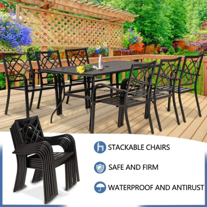 With 6 chairs and 1 rectangular table, this set has plenty of room to dine in style. The table also features a 1.57" umbrella hole, so you can create that parasol oasis you've always dreamed of! Plus, its metal tabletop makes it extremely durable and easy to clean, just wipe with a damp cloth! 22"L x 22.2"W x 35"H