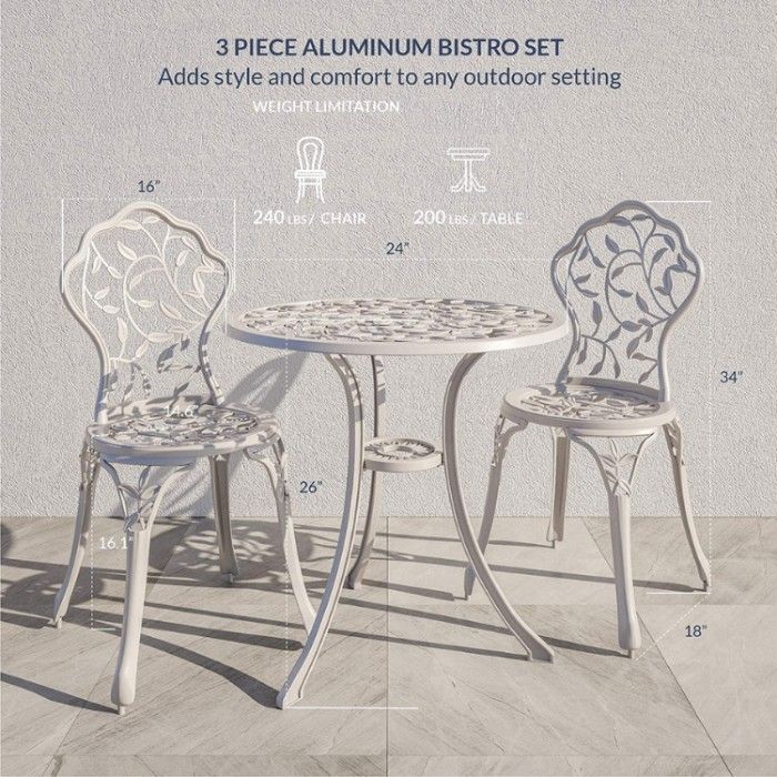 For those with limited space, this 3 piece bistro set has you covered. The set includes a round bistro table measuring 24 inches in diameter, and 28 inches tall, with a weight capacity of 200 lbs.
